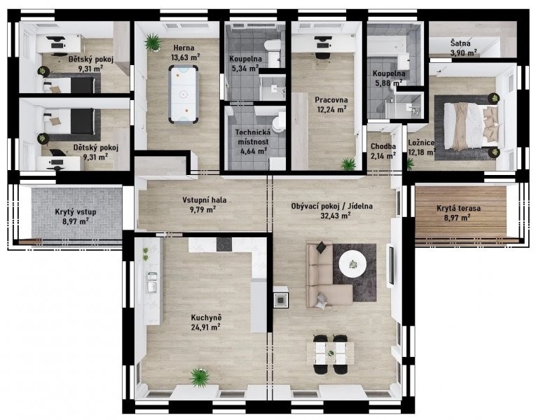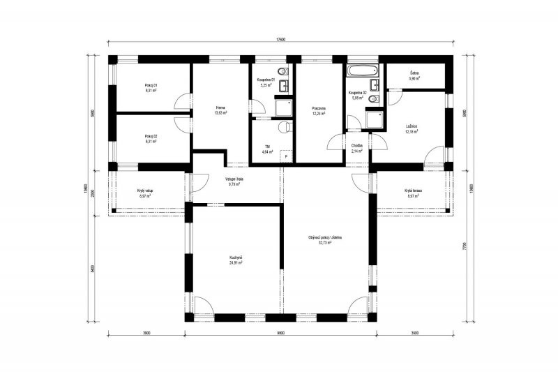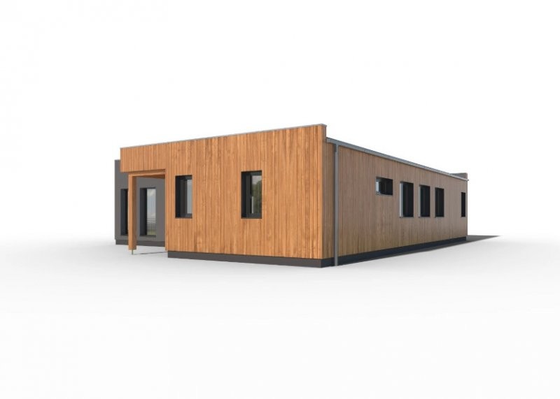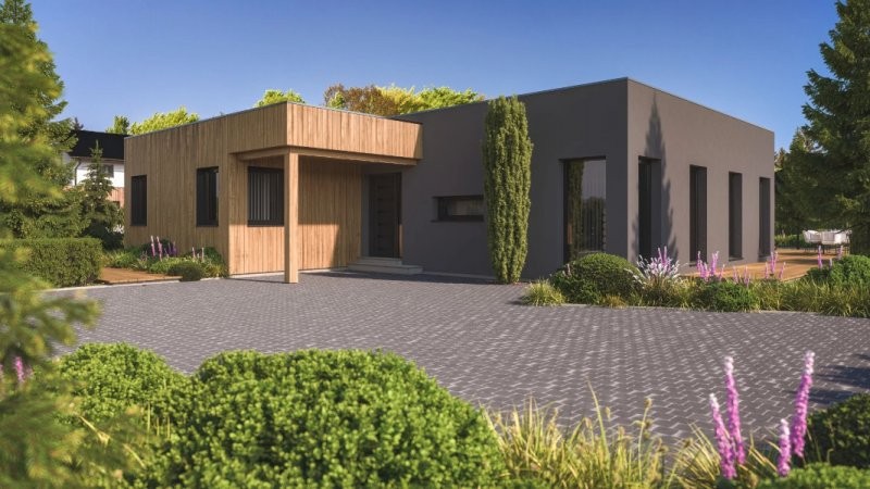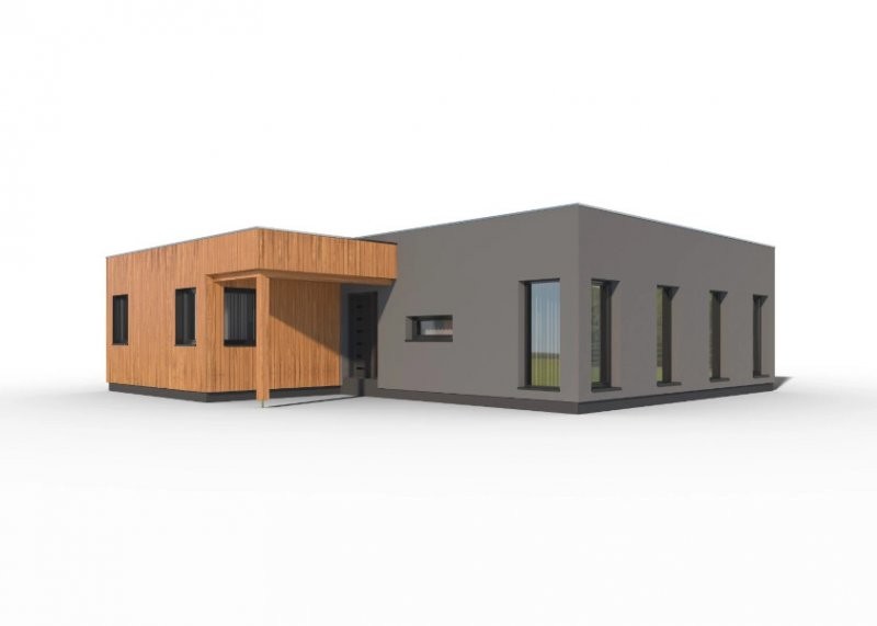 Bungalov Inspirace 3-146 skrývá za rovnými liniemi moderního vzhledu velký obývací pokoj s oddělenou kuchyní, které lze jednoduše propojit. Další tři ložnice a pracovnu doplňuje ještě herna a dvě koupelny, šatna a technická místnost. U vstupu do domu je kryté závětří a na druhé straně domu krytá terasa, navazující na obývací pokoj.