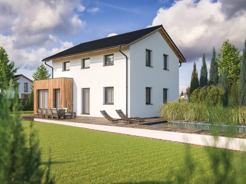 Pro dům Jubilée 1-126 vybrali architekti společnosti Haas Fertigbau půdorys 10,8 x 9,5 m se zimní zahradou. Užitná plocha 126 m2 skrývá dispozici 5 + KK. Zimní zahradu s velkými prosklenými plochami zakrývá moderní plochá střecha.