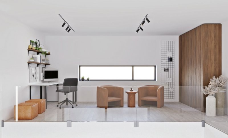 Druhé patro pak můžeme využít dle naší libosti. Jedna z variant nabízí vzdušnou pracovnu a vstup do pokoje, který v jednom netradičně řešeném prostoru propojuje ložnici, obývací pokoj, šatnu a koupelnu.