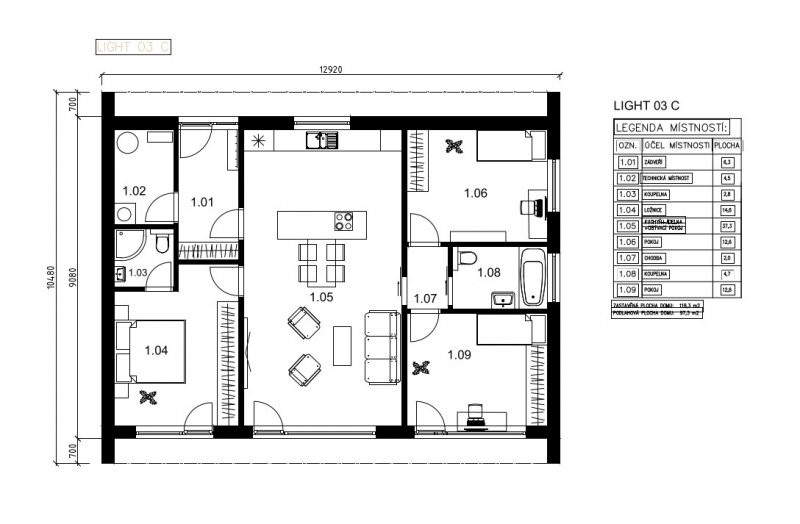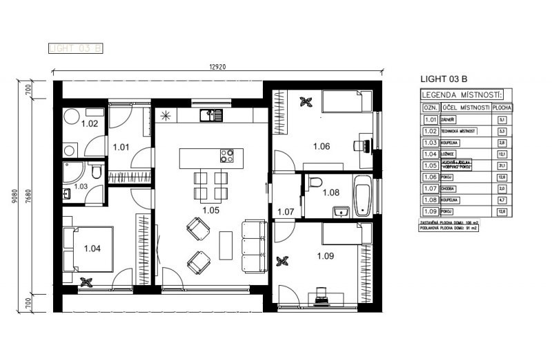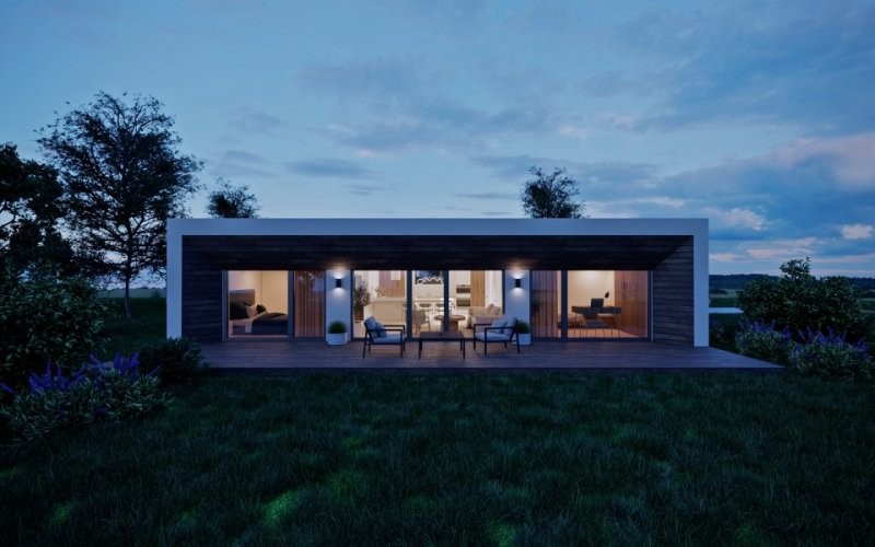 Třetí dům z řady LIGHT s podlahovou plochou 85m2 až 97,3m2 vytvoří ideální domov menší rodině nebo jednotlivci. Dispozice 3+kk nebo 4+kk je elegantně rozčleněná do dvou pomyslných částí.