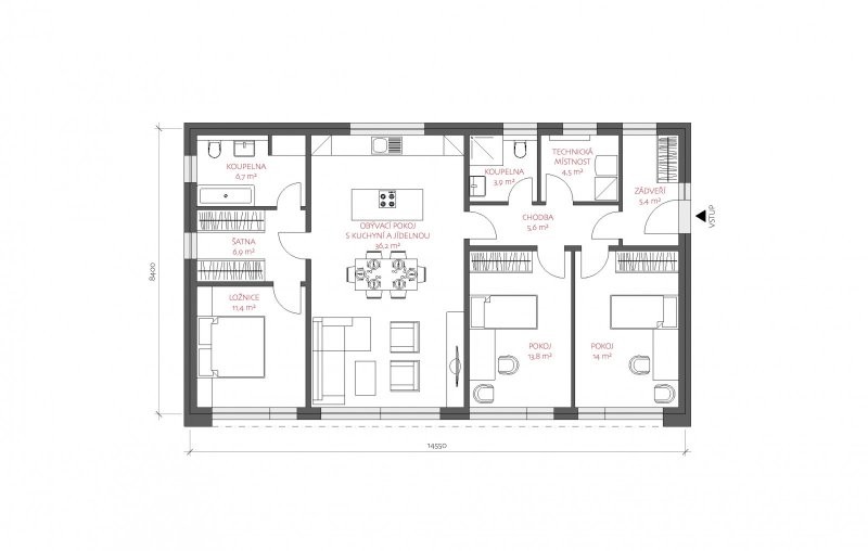 Moderní typový dům LUCERN 122 se sedlovou střechou a velkými okny směřovanými na jih, díky kterým je dům krásně prosvětlený. Tato dřevostavba je navržena pro čtyřčlennou rodinu.