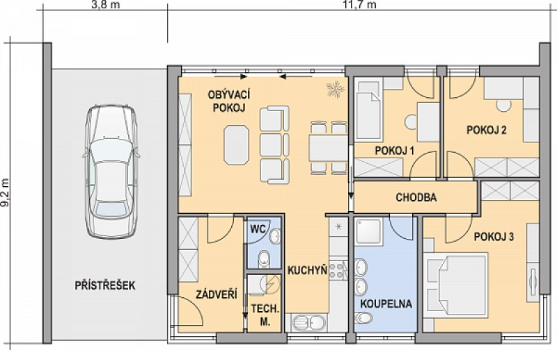 LUCIE je dům větší velikostní kategorie s garážovým stáním. Je vhodný do jednopodlažní zástavby. Uspokojí 3 – 4 členné rodiny. Druhý pokoj lze využít jako dětský pokoj, pracovnu nebo jako pokoj pro hosty.