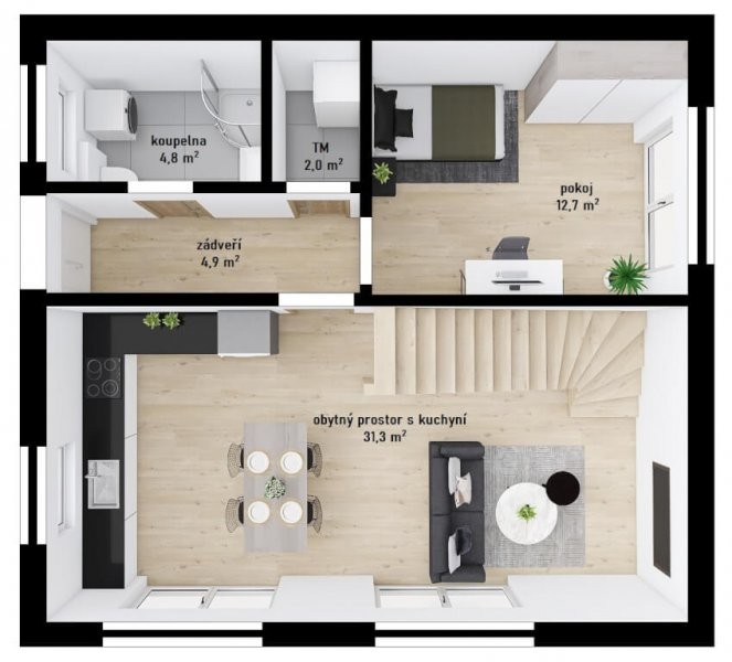 Patrová dřevostavba má půdorys ve tvaru obdélníku o rozměrech 7,9 x 8,7 m. Interiér má promyšlené dispoziční rozdělení domu na společenskou a klidovou. Nevyhovujeme vám půdorysné řešení? Upravíme celý dům podle vašeho přání.