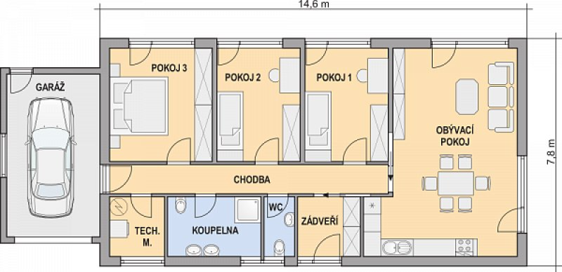 MARKÉTA je dům větší velikostní kategorie s garáží. Je vhodný do jednopodlažní zástavby. Uspokojí 3 - 4 členné rodiny.