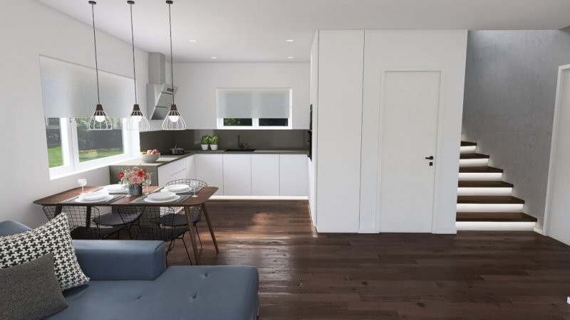 Nová podoba dřevostavby s názvem Minor 131 jistě osloví mnoho zájemců. Je symbolem nadčasové architektury. Do domu jsou zakomponovaná velká okna, která přivádí do všech prostorných místností mnoho světla. Nejvíce prosklených ploch má samozřejmě obývací pokoj spojený s kuchyní. Podschodišťový prostor u kuchyně můžete využít jako spíž. Přímý přístup do zahrady oceníte zejména v letních měsících.