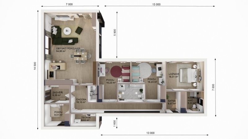 Příjemný bungalov s užitnou plochou 160,5 m2 osloví větší rodinu i ty, kteří potřebují dostatek prostoru pro své koníčky. Dokážeme si představit, že pokoje, které máme v půdorysu navržené jako dětské, se dají využít jako pracovny, ateliéry, zkušebny aj.