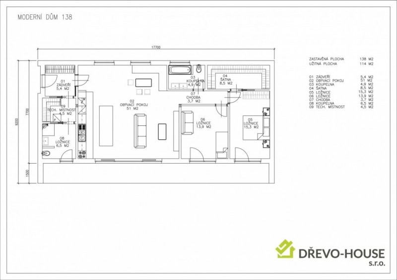 Nízkoenergetický moderní dům 138 je určen pro milovníky vzdušných prostorů a velkých teras. Zastřešená terasa podél celého domu vybízí člověka žít život spojený s venkovním prostředím. Jedná se nízkoenergetický dům s dispozicí 3+kk, avšak dům poskytuje dvě koupelny, velkou šatnu a obrovský obývací pokoj s kuchyní.