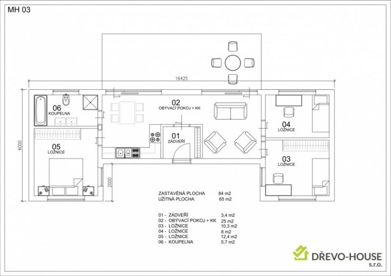 Mobilhouse MH03, může hravě konkurovat domům určeným pro rodinné bydlení. Je složen ze tří modulů a to 2x modul MH01 a modul MH2 vzájemně propojenými. Modul MH02 je zde koncipován jako spojující element mezi dvěma klidovými zónami. Zároveň je zde chytře oddělena obývací část a kuchyně. Oba prostory jsou výjimečně prosluněny. Modul dále nabízí tři krásné ložnice s výhledem do krajiny a komfortní koupelnu.