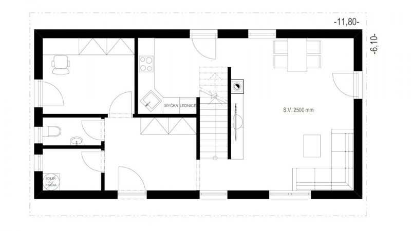 Dispozice je klasická 5 + kk ve dvou podlažích se zajímavým průhledem z galerie, užitná plocha domu je 114 m2. Za příplatek je také možné dům prodloužit.