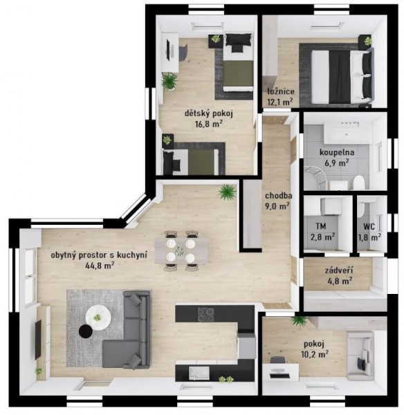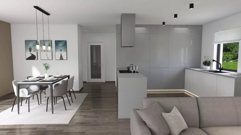 Bungalov má půdorys ve tvaru "L" o rozměrech 12,43 x 12,83 m. Interiér je rozdělený na dvě části - obytnou a klidovou s ložnicemi. Konkrétní dispozice domu upravíme podle vašeho přání.