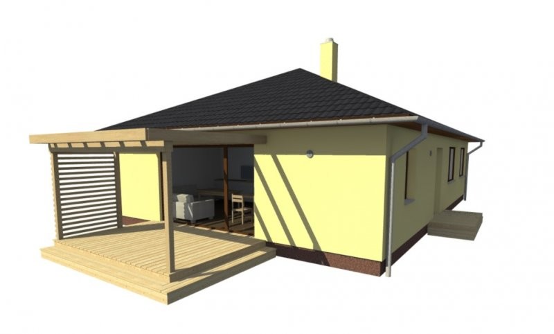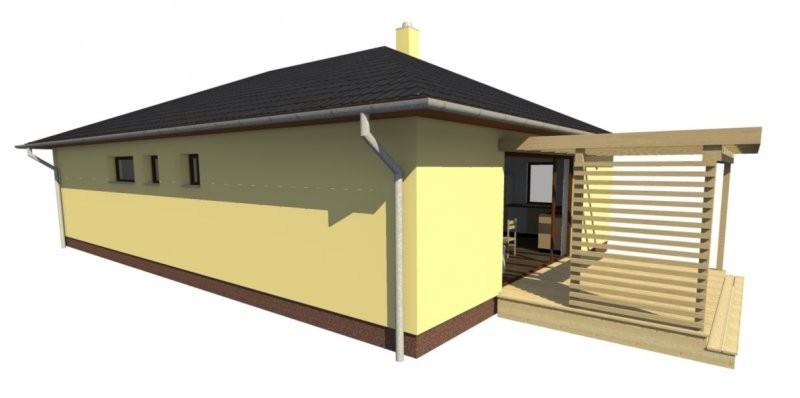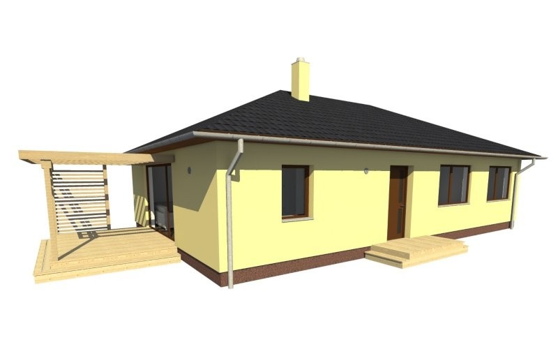 Cílem typového domu Optimal 05 je nabídnout dispoziční řešení 4kk do 100m2 užitné plochy. Dům reaguje na zvyšující se poptávku domů se vstupem z jihu! Jedná se o jednoduchou hmotu domu, kde je každý detail dokonale promyšlený. Dům je volně stojící přízemní stavba s valbovou střechou (dle požadavků může být i sedlová, plochá, pultová). V objektu se nachází zádveří se šatní skříní a dostatkem prostoru pro sedací botník. Nika pro knihovnu v chodbě oživuje páteř celého domu. Z této domovní komunikace jsou přístupné všechny místnosti v domě. Velkorysé obytné pokoje o min. velikosti 12m2 jsou doplněny funkčním zázemím na severní straně domu. Třešničkou na dortu je pak prostorný obývací pokoj s jídelnou, z které je možný přímý vstup na terasu. Nechybí zde ani prostor pro krbová kamna/vložku. Kuchyň doplněna o tolik opomíjenou spíž.