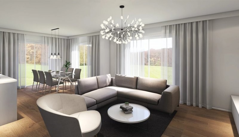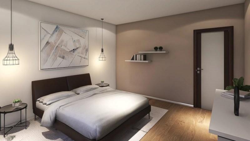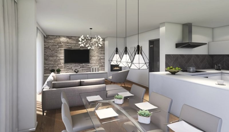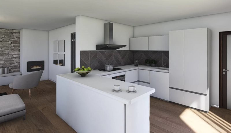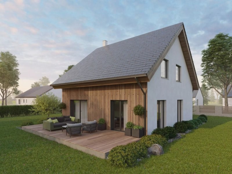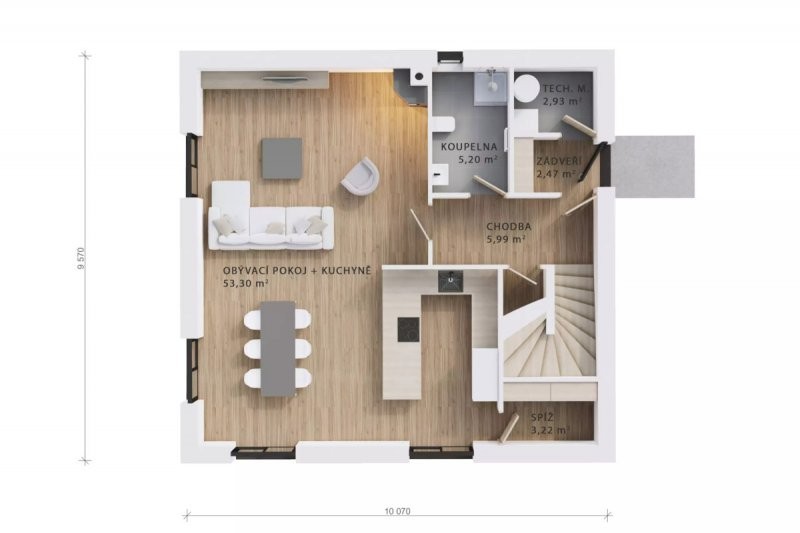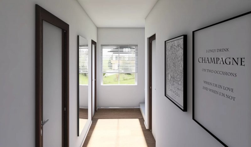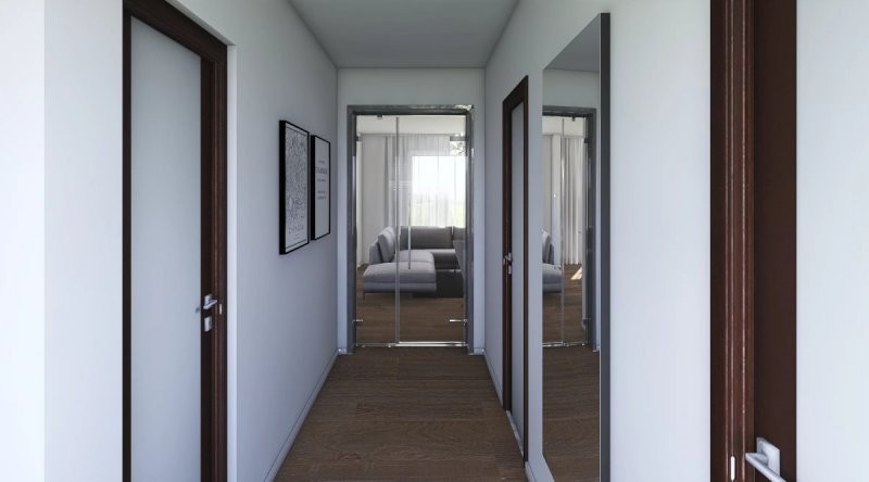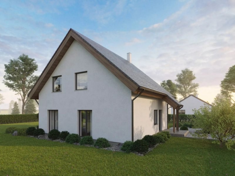 Velmi efektivně řešený dům do patra o dispozicích 4+kk. Přízemí se vyznačuje prostorným obývacím pokojem s kuchyňským koutem o velikosti 35,3 m2, koupelnou, samostatným WC, spíží a menším zádveřím. V horním patře se pak nalézá velká ložnice a 2 pokoje. Vše je doplněno koupelnou.