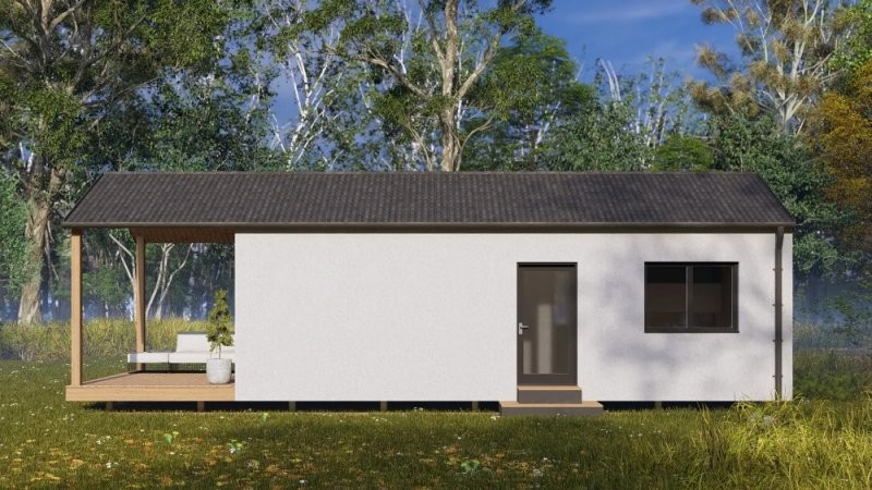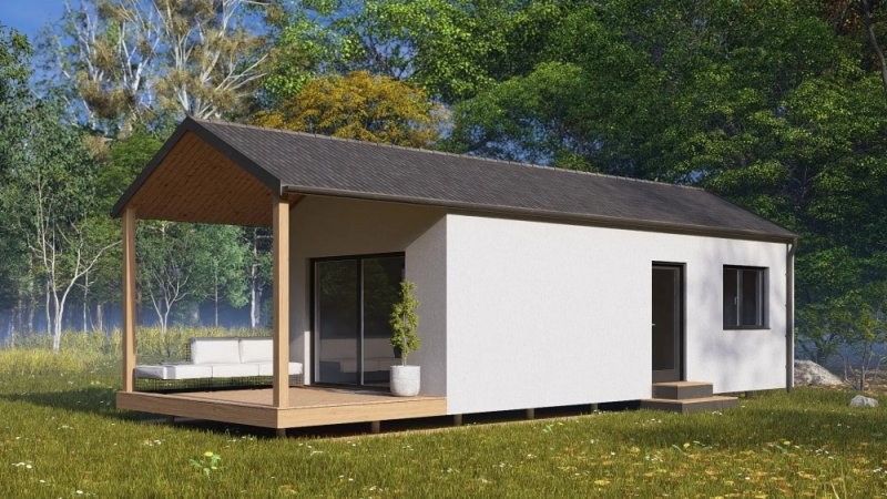 Dům má dispozici 2+kk (užitná plocha domu je 34 m2 a terasa 12,3m2), což je ideální velikost pro menší rodinný dům, nebo rekreační objekt. Dům bude postaven na zemních vrutech, které zajišťují stabilní a spolehlivý základ. Vytápění je řešeno elektrickým podlahovým topením. Okna jsou kvalitní trojskla v antracitové barvě, přičemž v obývacím pokoji s kuchyní najdete velké balkonové dveře, které zajišťují dostatek denního světla a krásný výhled na terasu. Koupelna je kompletně zařízená a součástí domu je i vinylová podlaha, stylové interiérové dveře a bojler na ohřev vody. Na výběru interiéru ( podlahy, sanita, dveře a vzoru obkladů a dlažeb) se lze podílet u našeho dodavatele ( SIKO/Keramika Soukup).