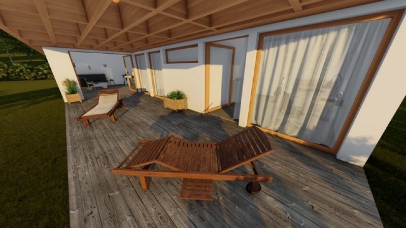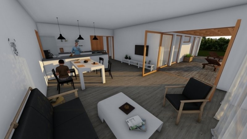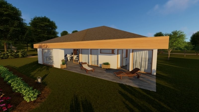 Dřevostavba na klíč do L vytváří soukromý prostor otevřený do zahrady s využitím stíněné terasy. Pevná záda, otevřená náruč. To jsou typické rysy této dřevostavby na klíč.