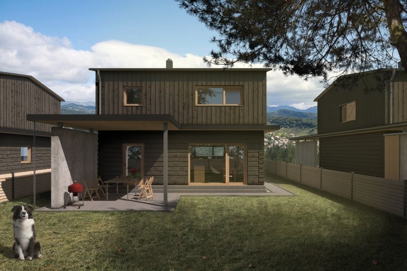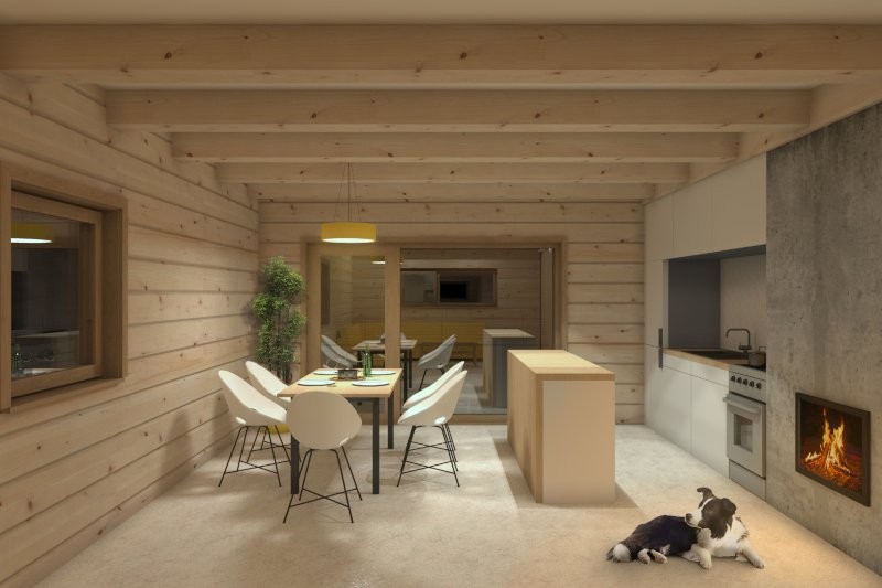 Úsporná moderní roubenka s rustikálními prvky vhodná do příměstské zástavby.