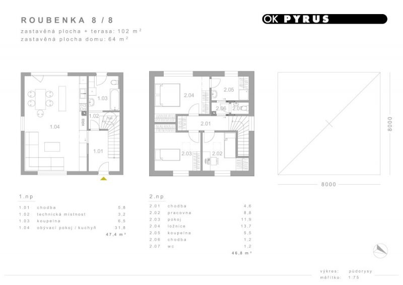 Na zastavěné ploše 8 x 8 metrů jsou splněny základní požadavky pro 3-4 člennou rodinu