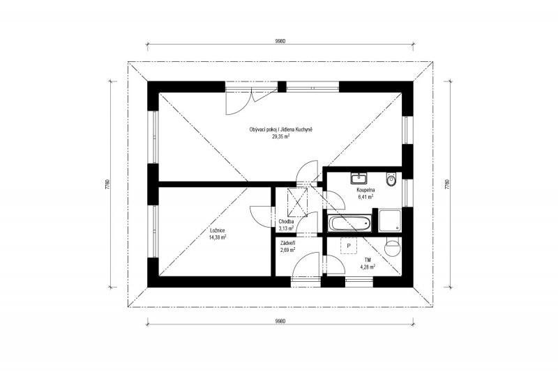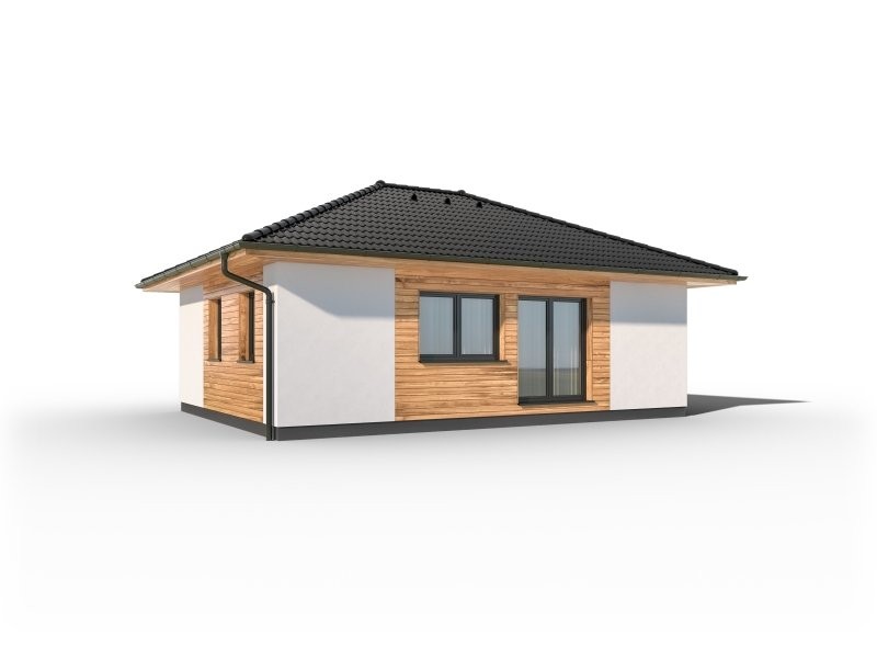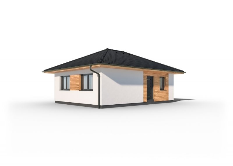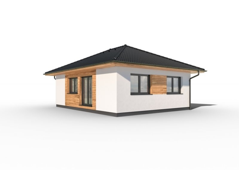 Bungalov Rapido 1-60, ideální dřevostavba pro mladé páry či seniory. Zabírá pouhých 77 m2 zastavěné plochy s dispozicí 2 + KK s prostorným obývacím pokojem propojeným s kuchyňským koutem a pohodlnou ložnicí. Půdorys dopňuje koupelna a technická místnost.