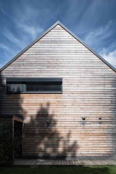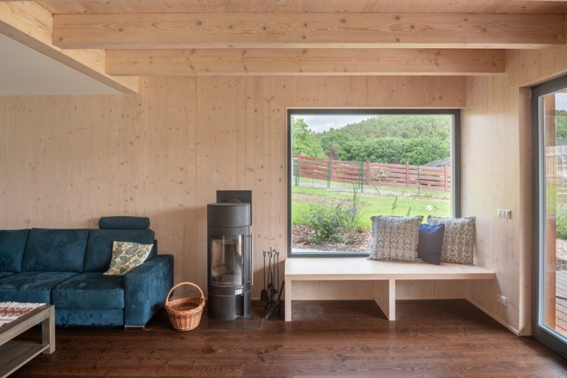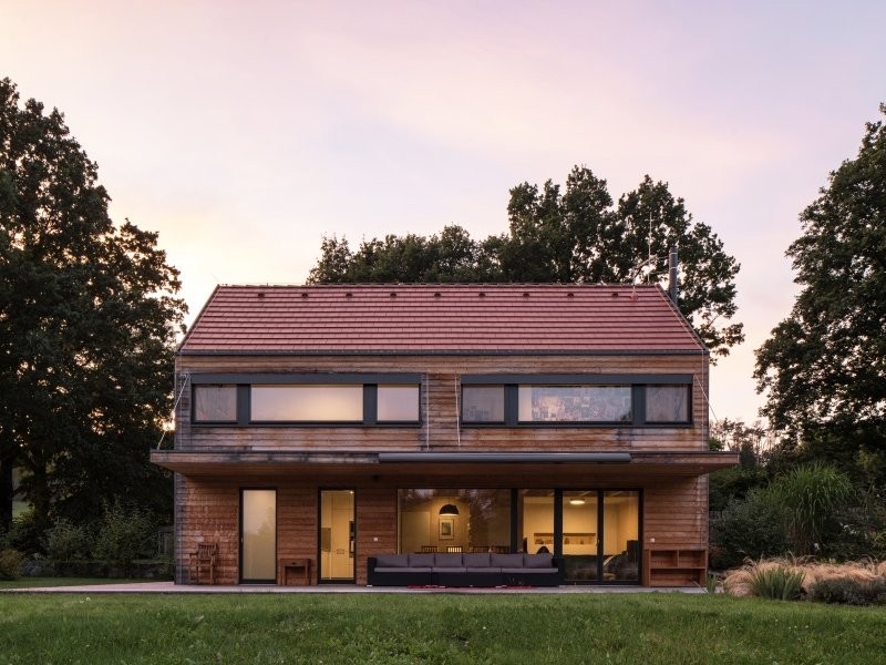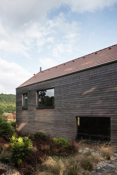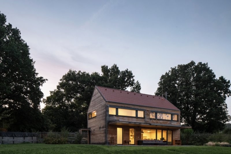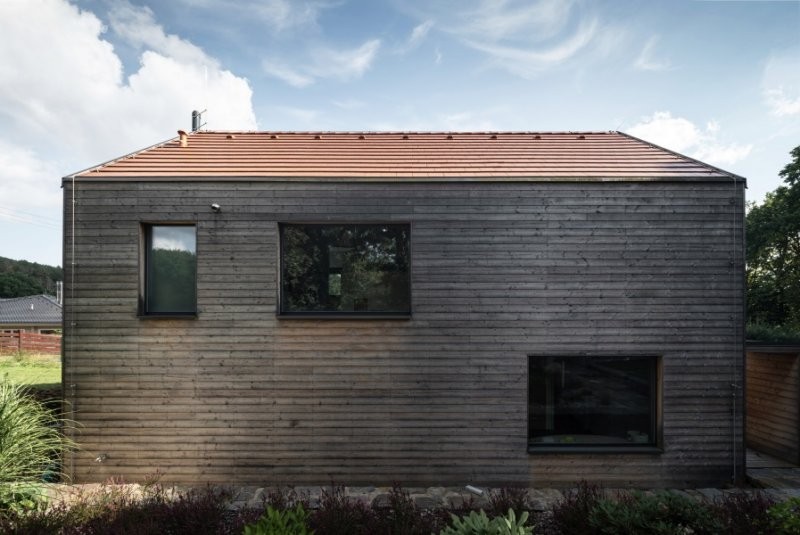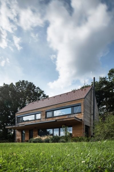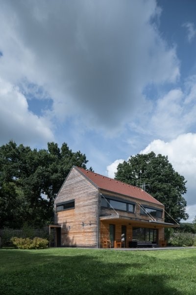 Stavba je na pozemku umístěna s ohledem na stávající zástavbu a v návaznosti na přilehlou komunikaci. Dům je otevřen směrem k jihu do zahrady, čímž dodává vnitřnímu prostoru domu patřičnou intimitu a umožňuje v zimních měsících využití nemalých tepelných zisků ze slunečního záření. V letních měsících jsou tyto zisky eliminovány zavěšeným zastíněním z dřevěné konstrukce. Nosný systém RD - stěny tvoří lepené masivní dřevěné panely Novatop Solid tl. 84 mm. Nosný systém GARÁŽE - stěny tvoří lepené masivní dřevěné panely Novatop Solid tl. 62 mm.