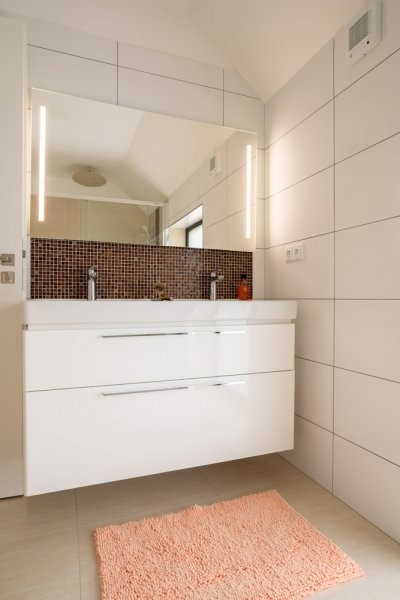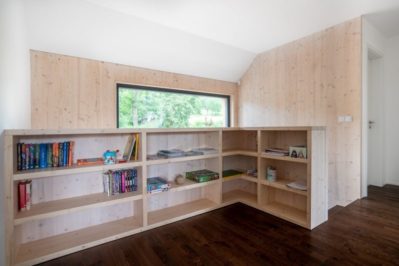 V patře je součástí chodby malá čítárna s knihovnou. Je zde samostatné wc, koupelna, ložnice a dva velké pokoje. V podhledu chodby jsou umístěny stahovací schody, po kterých je přístup do půdního prostoru, jenž skýtá velké úložné prostory.