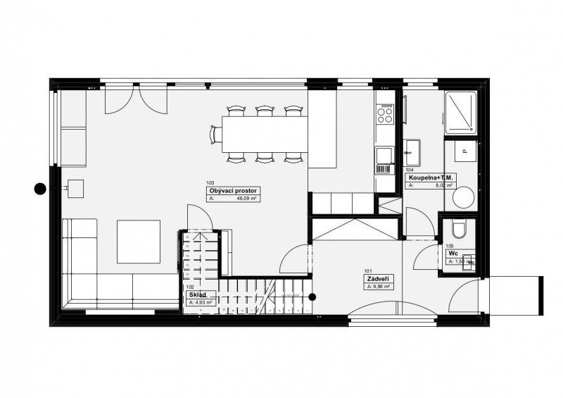 Dispozice tohoto domu byly nejvíce ovlivněny požadavkem investora na společné prostory. Jelikož dům nyní slouží převážně k rekreačním účelů a klient požadoval možnost posezení většího množství lidí, je tomuto požadavku podřízen obytný prostor, který je zároveň propojen s venkovní velkou terasou. Terasa je zastřešena „kšiltem", který dovolí ji užívat i během deštivých dnů. Zároveň slouží v letních měsících jako pasivní stínění prosklené stěny obývacího pokoje. Další nesporná výhoda tohoto zastřešení je fakt, že odstíní hluk bavící se společnosti na terase a neruší tak spící v pokojích v patře. Krom zádveří a skladu se v přízemí nachází koupelna, která je hojně využívána hlavně v letních měsících. V koupelně je za posuvnými panely schováno technické zázemí. Aby bylo docíleno segregace klidové a pobytové části, byl vstup na schodiště umístěn do zádveří, čímž došlo k eliminaci přenosu hluku z pobytové části přes schodiště do patra.