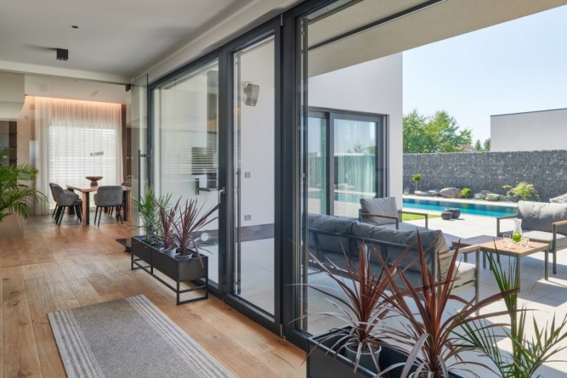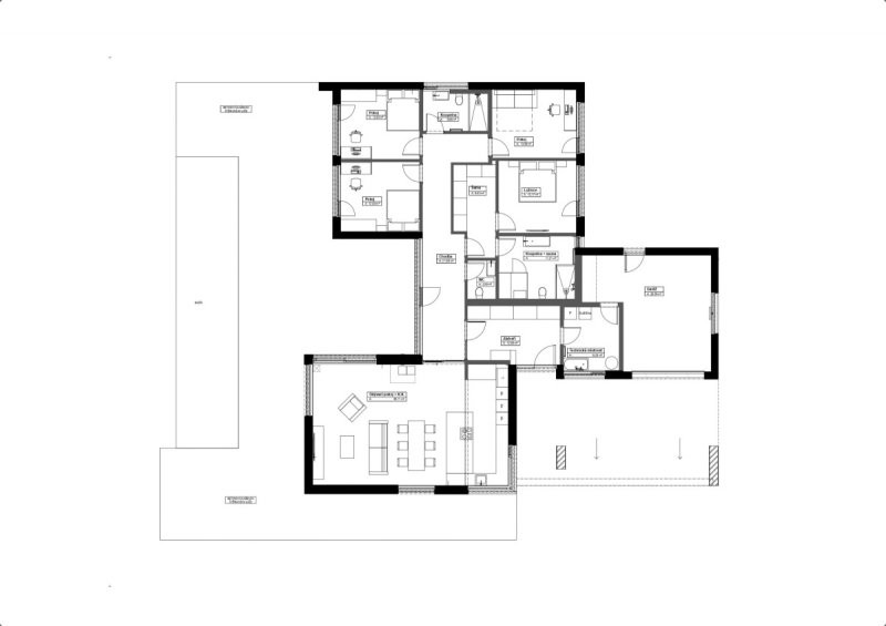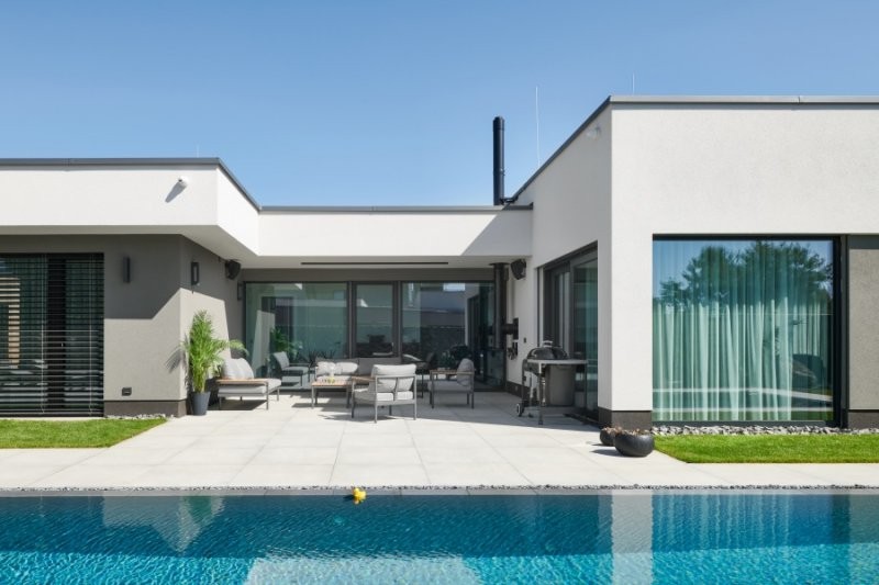 Součástí stavby je také zapuštěný bazén 14,0 x 3,0 m, který je propojený s domem terasou z betonové dlažby.