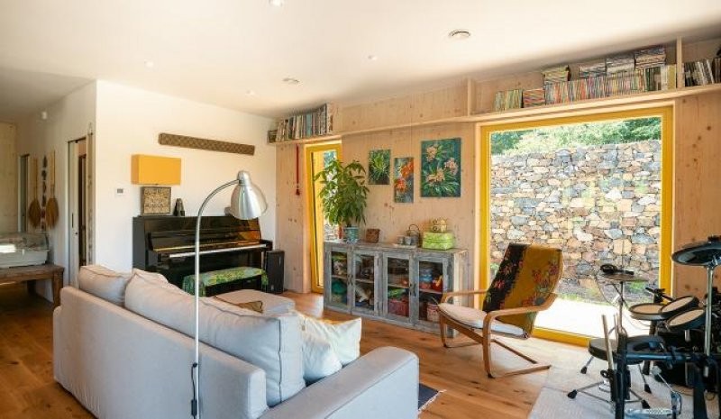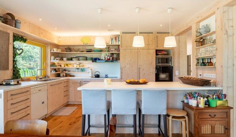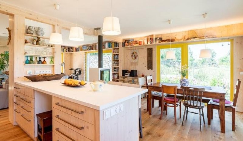 Návrh domu je silně inspirován japonskou architekturou tak, aby působil pozitivně na duši a mysl. Pozitivní pocit vyvolává kombinace světlého dřeva, žlutých oken a otevřeného podkroví. Interiér domu je zařízen nábytkem z tropických dřev, který je dovezen z východní Asie.