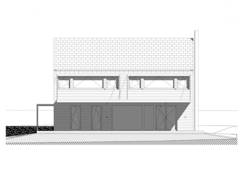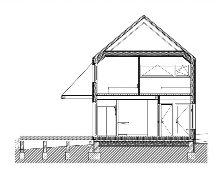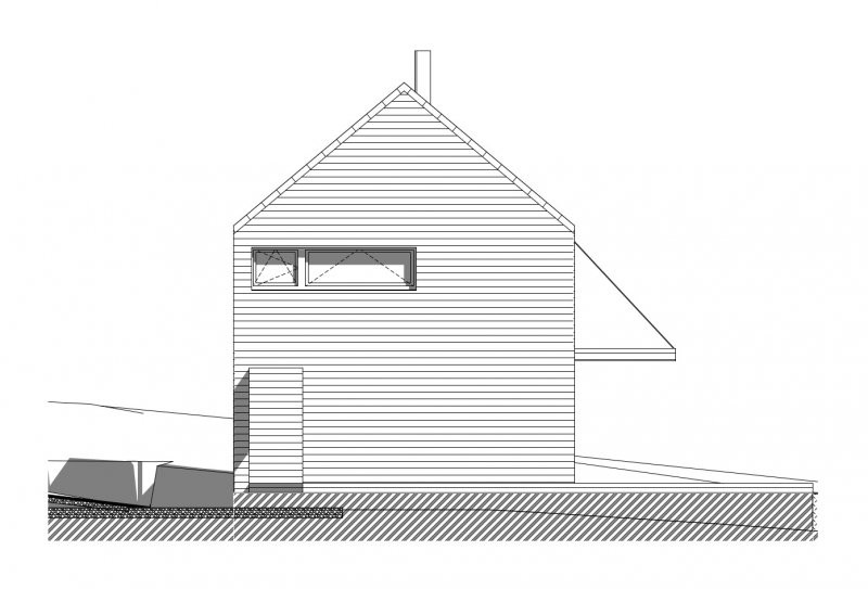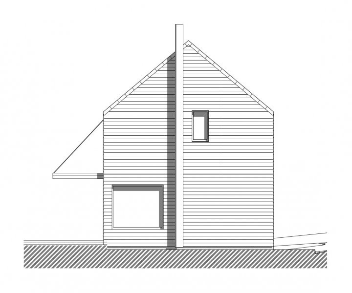 Dům je orientován na sever tak, aby poskytoval maximum soukromí a svou hmotou odstiňoval ruch od blízké komunikace. Přesahy střech jednak chrání dům před povětrnostními podmínkami a letním přehříváním, a jednak umožňují venkovní posezení na