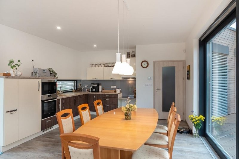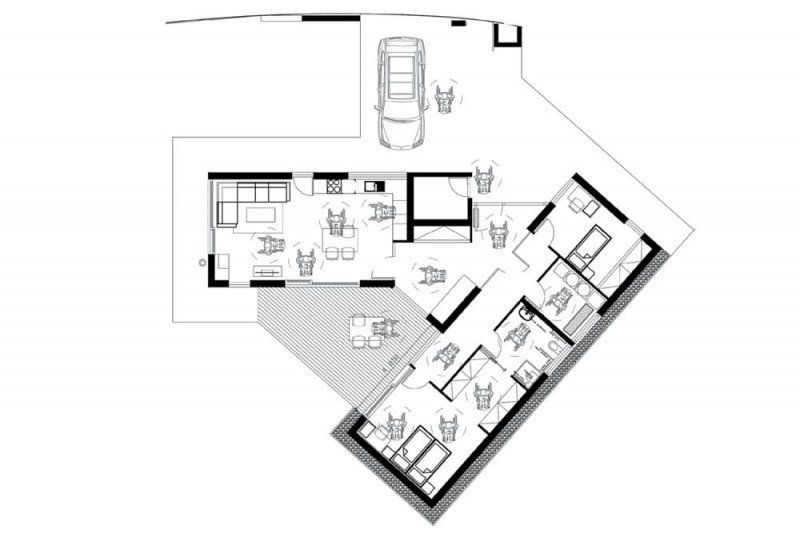 Dům na zakázku je zajímavý svým půdorysem, vhodně navrženým na daný pozemek. Dispozice je uživatelsky příjemně vytvořená a celkově působí interiér prosvětleně. Projekt zpracovával návrh rodinného domu, který slouží jako bezbariérový. Fasáda je kombinací obkladu modřínovými olejovanými palubkami a cementovláknitých desek.