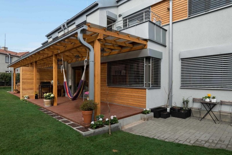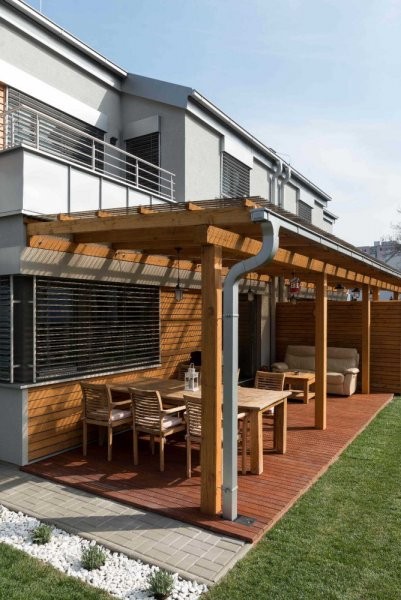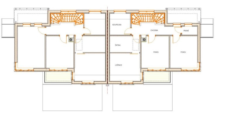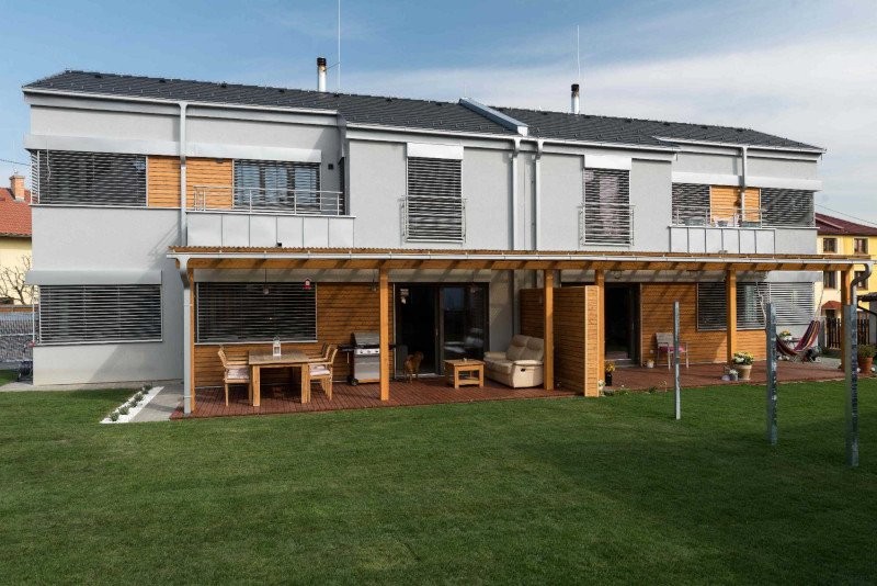 Individuální moderní dvoupodlažní rodinný dvojdům se sedlovou střechou je možné vystavět nejen ve velkém městě. Vnitřní dispozice umožňuje obyvatelům domu trávit čas společně, ale je pamatováno i na vlastní soukromí každého člena rodiny. Dům je doplněn o balkony, kryté terasy, které plynule navazují na zahradu.