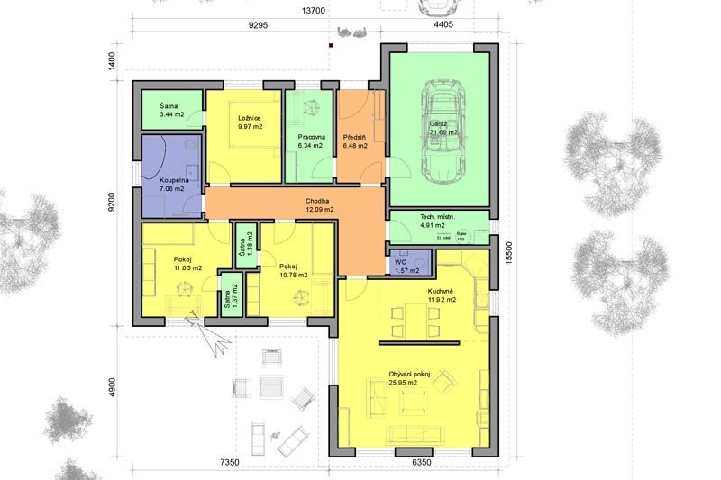 Cena dřevostavby na klíč je uvedena včetně základové desky a DPH. Vnitřní užitná plocha dřevostavby je 136,18 m2 včetně garáže.