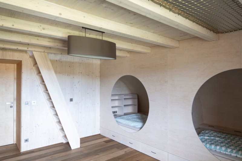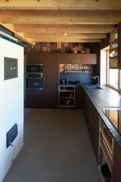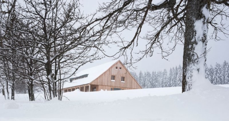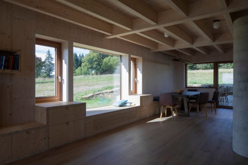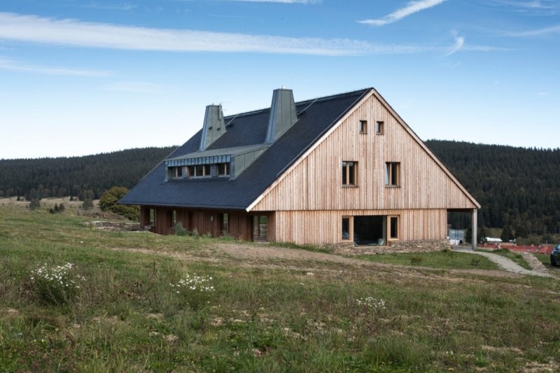 Navrhování dvojdomu vrhlo do zadání specifický faktor, který se ale nakonec ukázal jako velká výhoda. Díky relativně velkému půdorysu jsme mohli využít tradiční proporce v podobě velké střechy s přesahy, která sedí na relativně nízkém soklu přízemí, aniž by tím utrpěla funkčnost dispozice. Ta je řešená zrcadlově, až na mírně detaily jsou jednotlivé byty totožné. Dům je tradiční ve svém prvním výrazu, pevně usazený, jakoby vrostlý do země. V tom nám pomohl mírný svah, do kterého je hmota zasazená. Majitelé si nepřáli kopii roubenky, díky čemuž jsme k návrhu mohli přistoupit z hlediska současné doby a za to jsme velmi vděční. Ačkoliv na energetickou náročnost neměl klient zvláštní požadavky je dům nakonec úspěšně postaven jako nízkoenergetický.