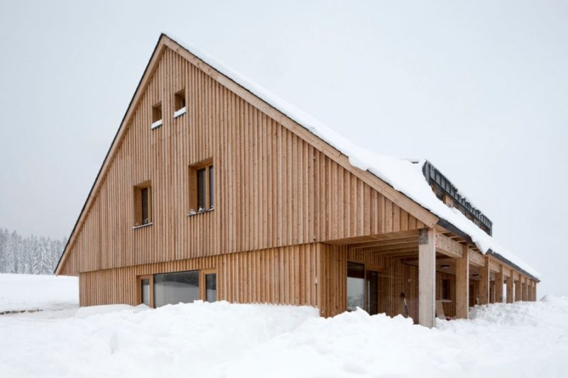 Dům je přesvědčivě tradiční ve svém základním vnějším výrazu, zároveň současný v použité konstrukční technologii. Jednoduché hmotě dominuje plocha střechy s krytinou ze štípané břidlice, členěná po obou stranách pásovými vikýři z předvětralého titanzinku. Přiznaný přesah střechy stlačuje hmotu přízemí, mírně roztažený příčný profil štítu, částečné zapuštění domu do mírného svahu, kamenné opěrné zídky, to vše podporuje horizontalitu základní hmoty. Dům je vrostlý, ukotvený do země. Skládaná fasáda ze sibiřského modřínu po letech zestříbřela a stavba vypadá, jakoby zde stála odjakživa.
