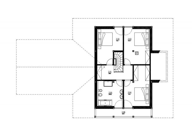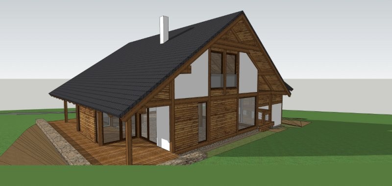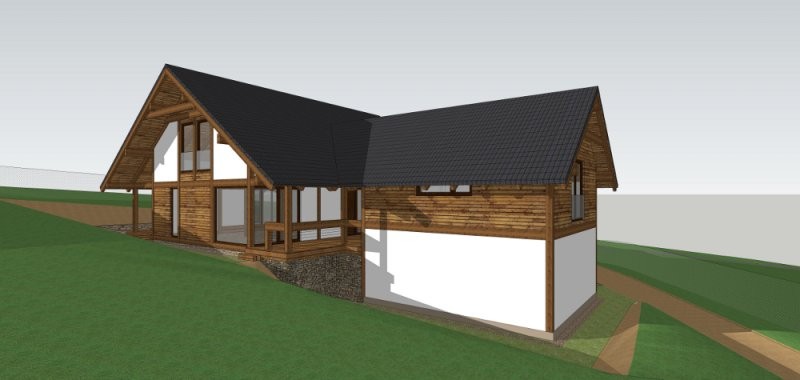 Tato dřevostavba těžkého dřevěného skeletu je navržena „na míru" k bydlení pro 4-člennou rodinu. K domu je krytou vstupní terasou připojena garáž pro dvě stání se samostatným apartmánem určeným k ubytování hostů.