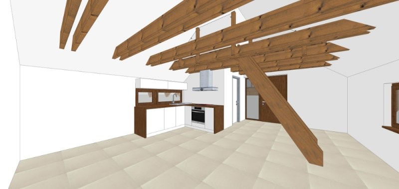 Dřevostavba má dvě patra. 1NP zahrnuje vstupní halu, ze které je možno vstoupit do obytného prostoru, wellnes nebo po schodišti do 2NP. Obytná část 1NP je orientována na jih s výhledem do zahrady a je z ní umožněn přímý vstup na terasy, které obklopují celý dům. Wellnes prostory jsou položeny na SV tak, aby z nich byl skrz velké prosklené plochy možný výhled na Krkonoše. Krb v obytné části dřevostavby je průhledový do wellnes, dodává tak teplo do obou částí. V 2NP jsou umístěny soukromé pokoje. Zajímavým architektonickým prvkem je částečně přiznaná konstrukce krovu, která dodá místnostem příjemný dřevěný design. Dřevostavba je navržena v nízkoenergetickém standardu, opatřena řízeným větráním s rekuperací. Apartmán pro hosty je umístěn nad garáží. Je zde opět použit částečně pohledový krov, do jehož části je vpasováno spaní.