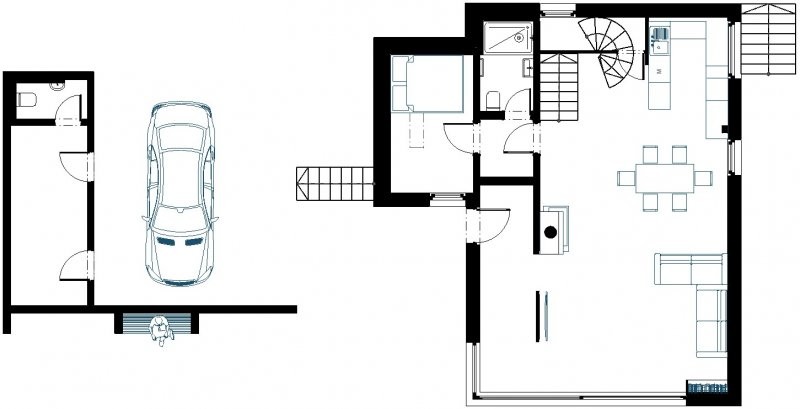 Zcela zásadní je spojení domu s venkovním prostorem, který je jedinečný a stavba ho maximálně využívá. Nalezneme zde 100m2 teras, většinou krytých, venkovní kuchyni, vířivku, a zahradu, o kterou se majitel stará již 30 let. Když se otevře HS portál a spojí se venkovní prostor s vnitřním, lze mít půl roku dům kontinuálně spojený s venkem. To vše je postaveno okolo zatopeného žulového lomu, který je dominantou pozemku. Lom má pláž a loděnici. Majitel chtěl, aby z domu bylo vidět na pláž.