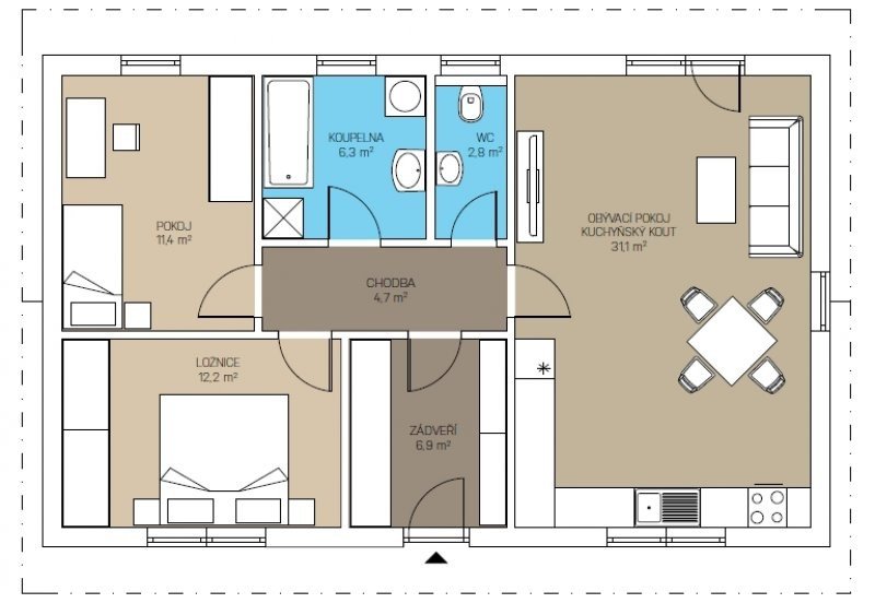 Omrzelo vás již bydlení v panelákovém bytě 2+1 na sídlišti a toužíte po životě v rodinném domečku se zahradou? Pak je náš bungalov MG 101 tím pravým řešením. Je jako stvořený pro mladé rodiny. Dispoziční řešení 3 + kk, kde ústřední místností domu je obývací pokoj spojený s kuchyňským koutem a jídelnou, přináší dostatečný prostor pro příjemné bydlení. Prostorné zádveří nabízí prostor pro umístění botníku i šatní skříně. Centrální prostor domu tvoří malá chodba, z které se dostaneme do ložnice i dětského pokoje. Velmi komfortně je řešeno sociální zázemí „stojedničky", kde je samostatná místnost WC s toaletou a umývátkem a také koupelny – tady je dostatek prostoru pro umístění jak pračky se sušičkou, tak i kotle s ohřívačem vody.