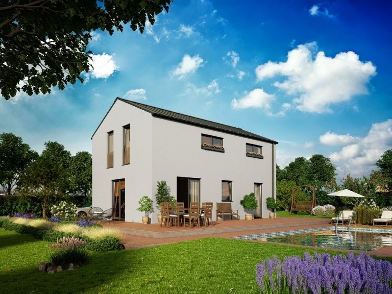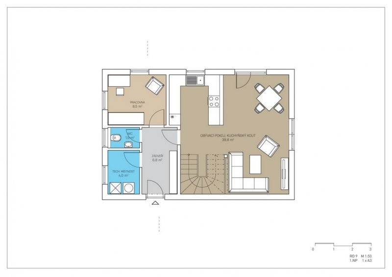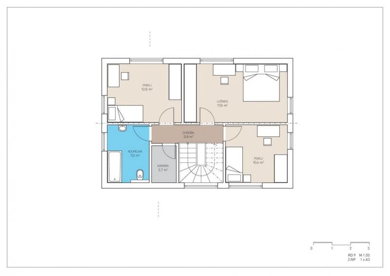 Tak trochu jiný? Ano. A čím? Moderně řešený patrový dům bez přesahů střechy, s velkými francouzskými okny ve štítech, ale také svou šířkou 7,0 m. Díky této velikosti se hodí i na užší pozemky. Na první pohled je také patrné, že podkroví má vysoké pozednicové stěny, které tvoří opravdu komfortní prostor ve všech patrových místnostech. Krásný interiérový prvek tvoří bukové schodiště, které je součástí obývacího pokoje, kde je také jídelní a kuchyňský kout. V přízemí je ještě samostatná místnost WC a dostatečně velká technická místnost. V patře nalezneme dva pokoje, ložnici a také koupelnu, vedle které je umístěna komora. Tu lze případně změnit na samostatné WC. Velmi pěkný a díky svému řešení i dostatečně prostorný rodinný dům, který zaujme na první pohled.
