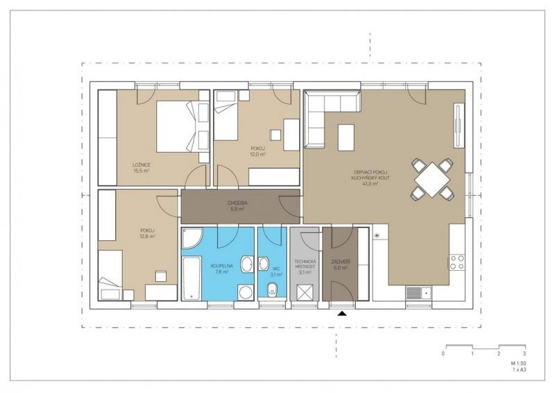 Jste čtyřčlenná rodina a hledá nové bydlení pro spokojený život? Rodinný dům MG 102 je přesně tím domem, který bude vyhovovat vašim představám včetně příznivé ceny. Dispozice domu je velmi variabilní, jelikož místnosti zádveří, komory, WC a koupelny lze dispozičně uspořádat tak, abyste z venku vcházeli zádveřím do chodby místo do obývacího pokoje. Z komory lze vytvořit spíž přímo sousedící s kuchyňským koutem. Komfortně navržený obývací pokoj s jídelním a kuchyňským koutem dává dostatek prostoru pro scházení celé rodiny a trávení společného času. Vše je doplněné dvěma dětskými pokoji, či pracovnou a prostornou ložnicí. Fasádu domu lze oživit dřevěným obkladem. Samozřejmostí je možnost doplnění o venkovní terasu, na které můžete trávit krásné slunečné dny.