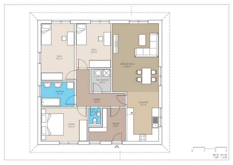 Rodinný dům se čtvercovým půdorysem nabízí dispozici 4 + kk. Dispozice je řešena tak, že je možné kuchyni navrhnout jako samostatnou místnost. To je ideální varianta pro ty, kteří mají rádi v obývacím pokoji klid a nechtějí být rušeni vařením v kuchyni. Samozřejmostí u této velikosti domu je samostatná místnost WC a koupelna, do které je možné umístit jak vanu, tak i sprchoví kout. Jistě oceníte i technickou místnost a velké zádveří. Centrální chodbou se dostanete do dvou pokojů a ložnice. V domě je obsaženo vše, co k pohodlnému životu potřebujete. Valbová střecha domu sluší a je i nejideálnějším řešením.
