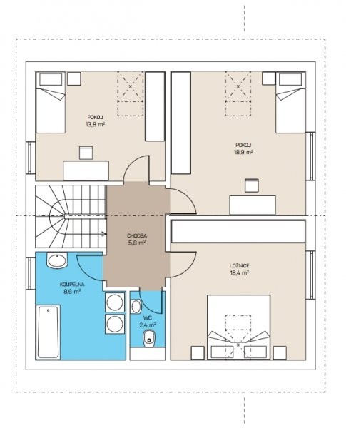 Dispozičně velmi dobře navržený rodinný dům, ve kterém je vše, co potřebuje rodina k pohodlnému žití. Hodí se také pro venkovské bydlení díky sedlovému tvaru střechy a podkroví. Do domu vejdeme zádveřím, ve kterém může být umístěna šatní skříň a botník. Na zádveří navazuje komora, ve které můžeme mít umístěn kotel a ohřívač vody, ale i pračku se sušičkou. Součástí přízemí je i koupelna. Do té se dostaneme z chodby, ze které je přístupný i pokoj a obývací pokoj s kuchyňským a jídelním koutem. Po krásném bukovém schodišti, které je jednou z dominant domu se dostáváme do podkroví, jež tvoří dva dětské pokoje a ložnice. Komfortně zařízené podkroví obsahuje i koupelnu a místnost samostatného WC. Střešní okna v pokojích zajišťují výborné prosvětlení všech pokojů.