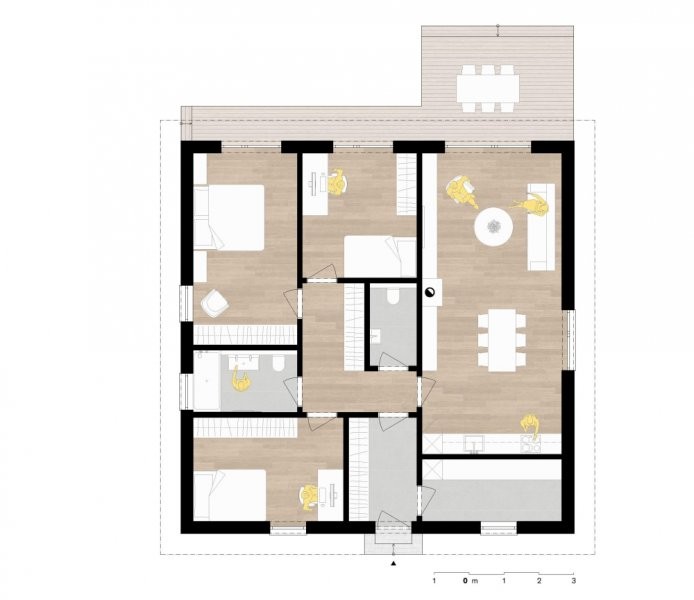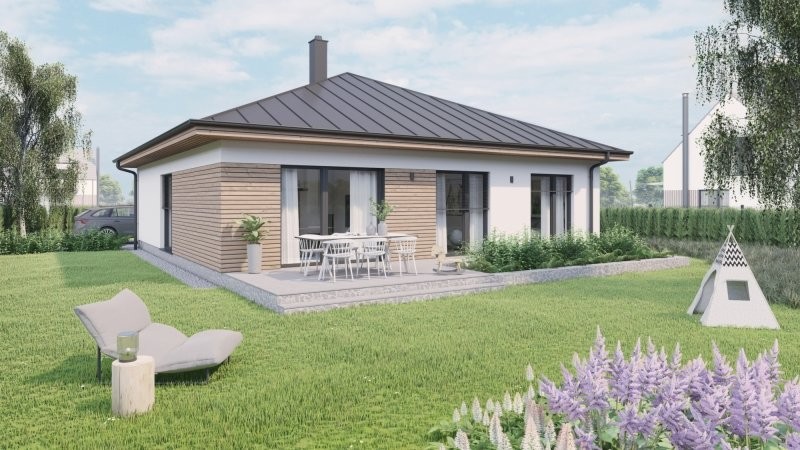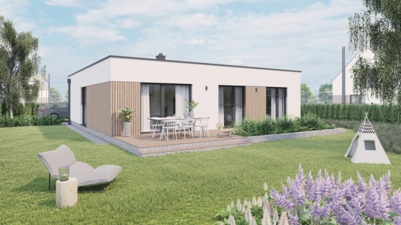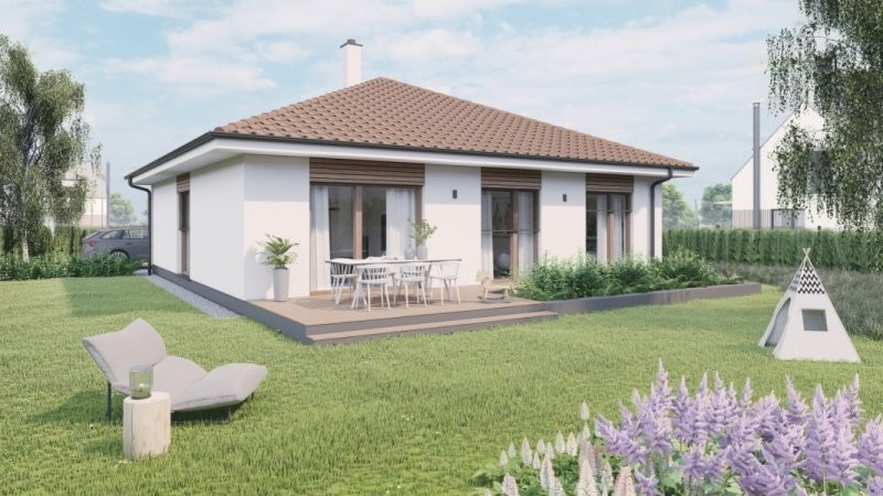 RD 104 je přízemní dům se čtvercovým půdorysem, který je vhodný na menší pozemky. Všechny obytné místnosti v domě jsou přístupny z chodby uprostřed dispozice.