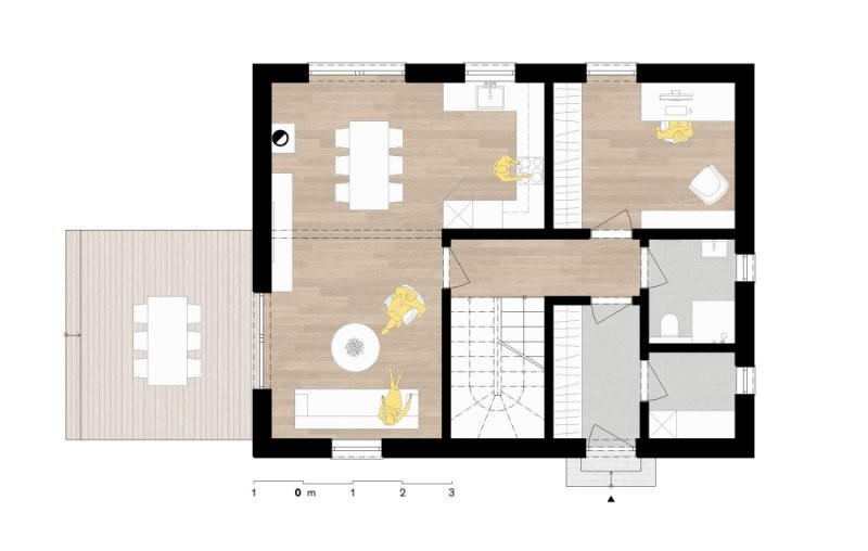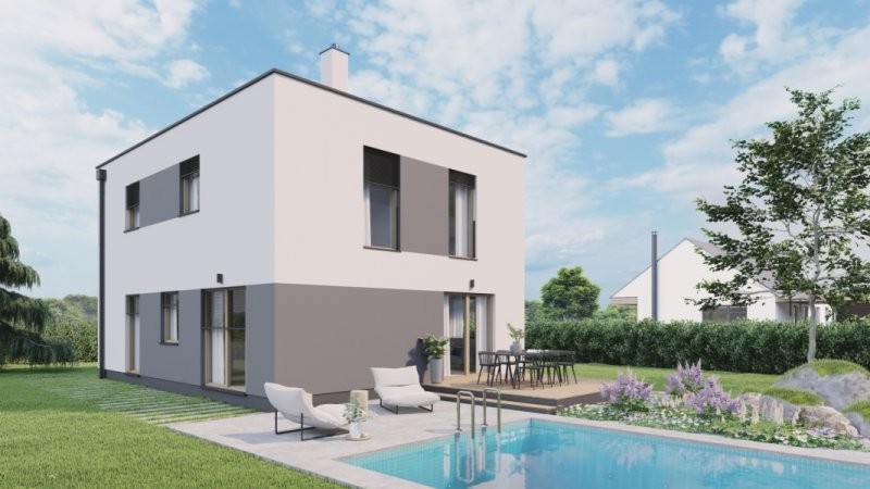 Jedná se o jednoduchý patrový dům s bočním vstupem, který i s malou zastavěnou plochu dokáže poskytnout dostatek prostoru pro komfortní bydlení velkých rodin. V přízemí se nachází zádveří, technická místnost, koupelna, pracovna a hlavní obytná místnost, na kterou navazuje venkovní terasa. V podkroví je ložnice, 2 pokoje, šatna a koupelna.