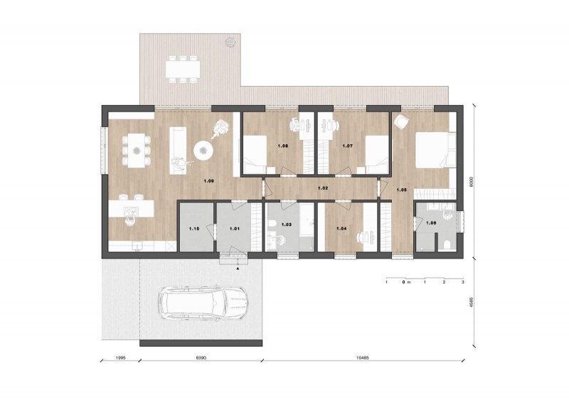 Jedná se o jednoduchý moderní přízemní dům s krytým parkovacím stáním. Hmotově dům odkazuje na tvar klasické české stodoly. Při navrhování byl kladen důraz na propojení všech obytných místností se zahradou.