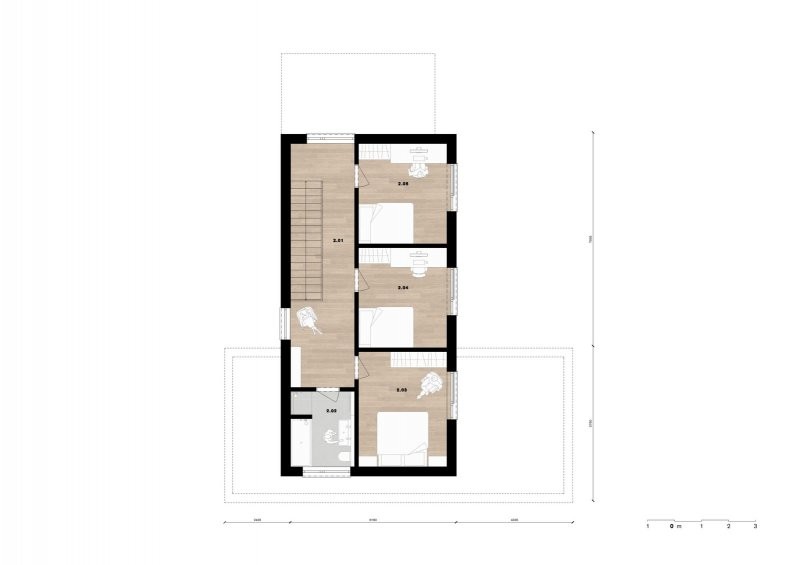 Jedná se o patrový dům, který je hmotově tvořen průnikem 2 kvádrů. Tyto kvádry jsou materiálově odlišeny. V přízemí domu se nachází kryté parkovací stání, krytý vstup se zádveřím, pracovna, hlavní obytná místnost, koupelna, technická místnost a schodiště. Ve 2.NP jsou 2 pokoje, ložnice a koupelna. Dům je navržen tak, aby mohl být použit i jako dvojdům, případně jako řadový dům.