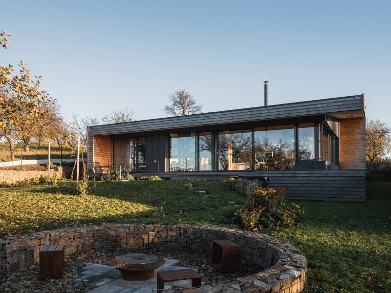 I když stavba na první pohled působí extravagantním dojmem, z okolní krajiny nikterak nevystupuje a je do ní citlivě začleněna. Dům je sice jednopodlažní, ale díky mírně svažitému pozemku si dopřává krásného výhledu na vrch Třemošná. Směrem k výhledům je objekt plně prosklen a přes terasu propojen se zahradou. Dostatečnou intimitu pobytovému prostoru dává vzrostlá zeleň, která je neoddiskutovatelným benefitem tohoto pozemku. Dům a okolní krajina jsou ve vzájemné harmonii.