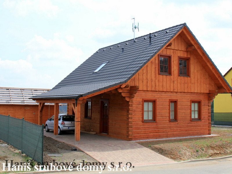 NÁŠ TIP - výhodná roubenka na klíč s bočním krytým stáním, použitelným také jako zastřešená terasa.