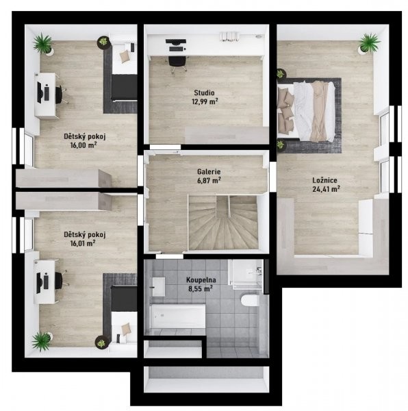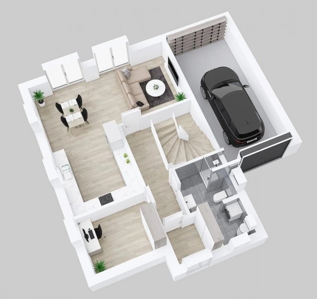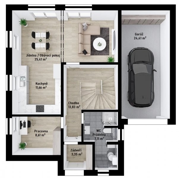 Stylový patrový dům Skywood 3-179, 6 + KK s garáží, pracovnou, dvěma koupelnami a několika sklady jistě uspokojí i ty nejnáročnější. V přízemí je komě obývacího prostoru s kuchyní ještě pracovna, koupelna a technická místnost. Další čtyři pokoje a kupelna v podkroví nabídnou dostatek místa i opravdu velké rodině.