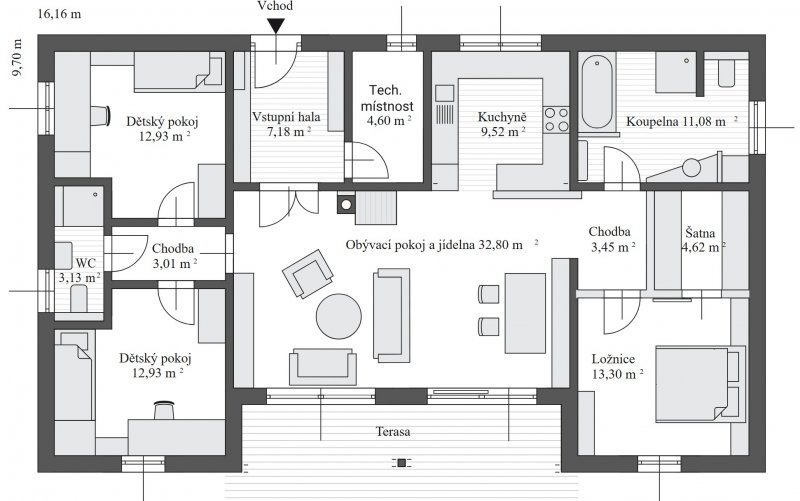 Má opravdu promyšlené uspořádání a šikovně odděluje ložnice dětí a rodičů, případně spací a pracovní část domu. Tím zajišťuje dostatek soukromí pro každého člena domácnosti. Půdorysný tvar do U vytváří navíc pěknou a chráněnou terasu přístupnou z centrální obývací části.