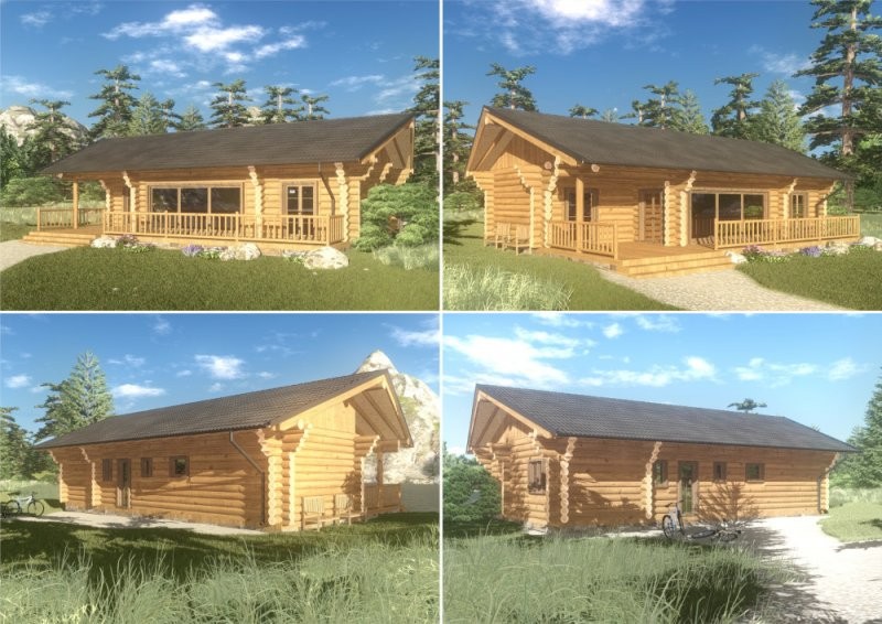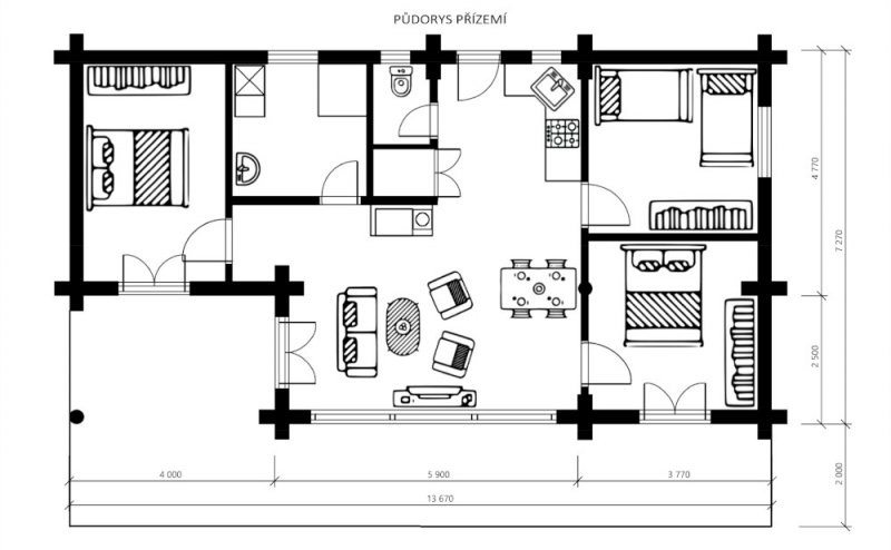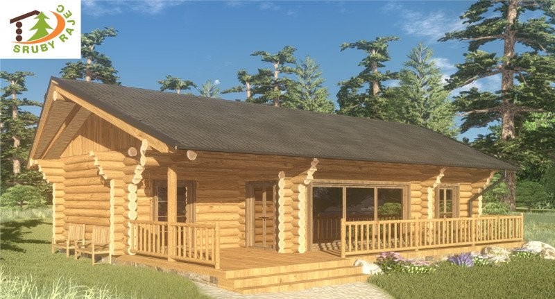 Přízemní srub s dispozicí 4+kk s přestřešenou terasou k využití jako menší bezbarierový rodinný domek či víkendový dům.
