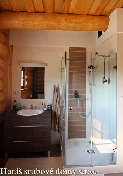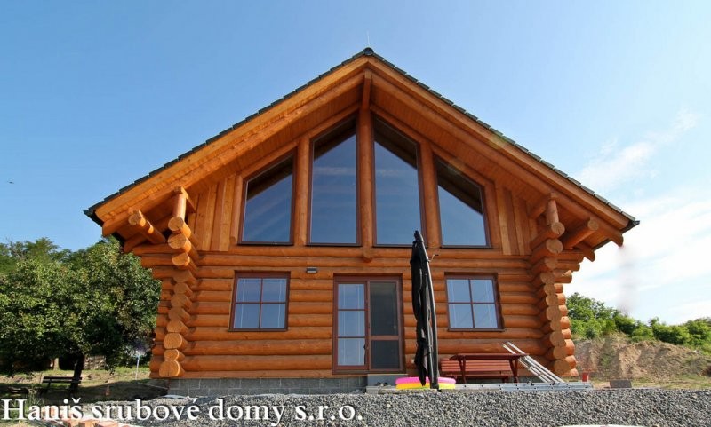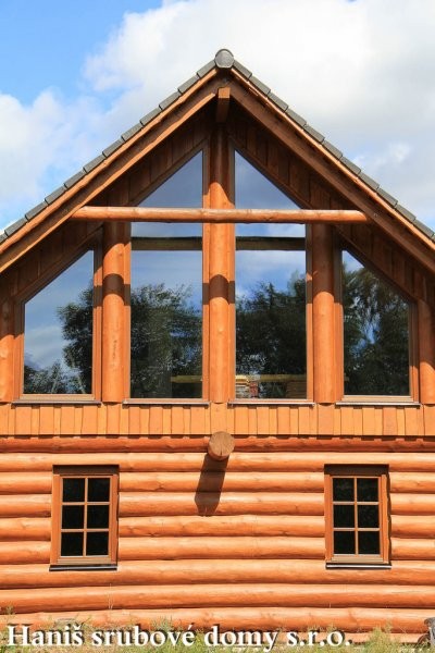 Srub na klíč Jirka je možné vybavit i prosklenými štíty, které od podzimu do jara pomáhají vytápět interiér. V letních měsících, kdy je slunce na obloze vysoko, chrání slunečnímu svitu větší štítové přesahy střechy.